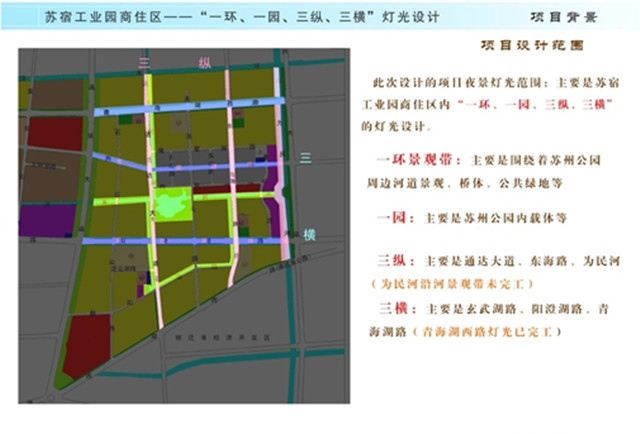本次商住區(qū)亮化提升工程圍繞“一環(huán)、一園、三縱、三橫”進行重點打造,燈光設計以“綠色的、生態(tài)的”為定位,不但要展示宿遷的城市特質,提升市民的自豪感和安全感,鼓勵周邊市民夜間步行,還將以現代科技之光區(qū)展現蘇宿園區(qū)騰飛的城市變遷。