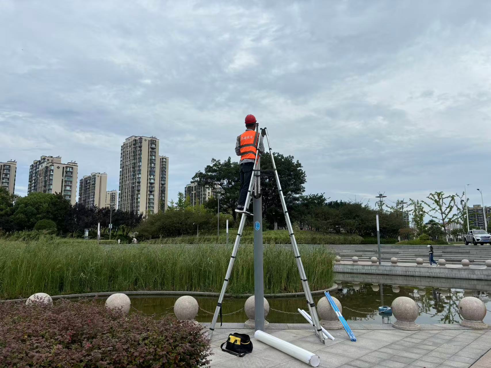 為民河、利民河沿岸、環(huán)形景觀帶及蘇州公園等區(qū)域的景觀燈也是重點排查對象。華燈初上,維護人員按照步巡計劃,沿河逐段細致檢查。他們對RGB全彩洗墻燈、景觀柱燈、抱樹燈等的運行狀態(tài)進行全面檢測:俯身檢查線路外皮是否因高溫開裂,確認沿河燈具安裝牢固程度,并對損壞燈具及時更換。