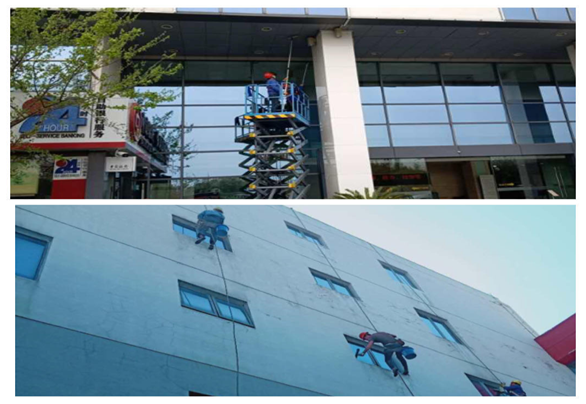 在安全施工的同時嚴(yán)格保證服務(wù)質(zhì)量,根據(jù)實際情況制定專業(yè)清潔方案,選用專業(yè)外墻清洗劑和玻璃清潔劑,結(jié)合使用了升降機、吊繩等方式進行施工操作,對管理樓外墻、幕墻、瓷磚墻面、燈具及道路等衛(wèi)生死角徹底清潔。