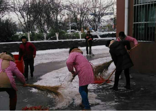 次日氣溫驟降,零下4度,多數(shù)路面存在結(jié)冰現(xiàn)象,加上路面落葉較多。天未亮,保潔、安保人員就到達園區(qū)公舍主干道、單元門、地庫出入口等指定區(qū)域,伴隨著凜冽的寒風,開始除雪化冰。對于他們來講,這注定又是忙碌的一天,經(jīng)過2個小時緊張而有序的忙碌,基本完成了各個園區(qū)公舍各個路面、單元門、非機動車道、地庫出入口積雪的清掃工作。