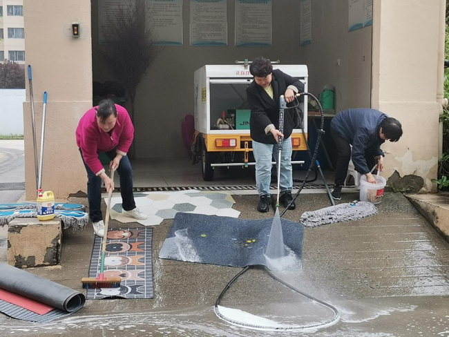 工作人員幫業(yè)主們清洗著臟臟的地毯,用高壓水槍耐心、仔細沖洗著地毯的正反面,小舉動,大關懷,每一次蹲下與起身,帶來的都是地墊的嶄新如初。